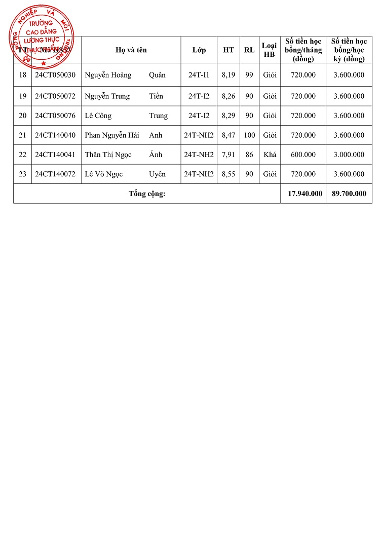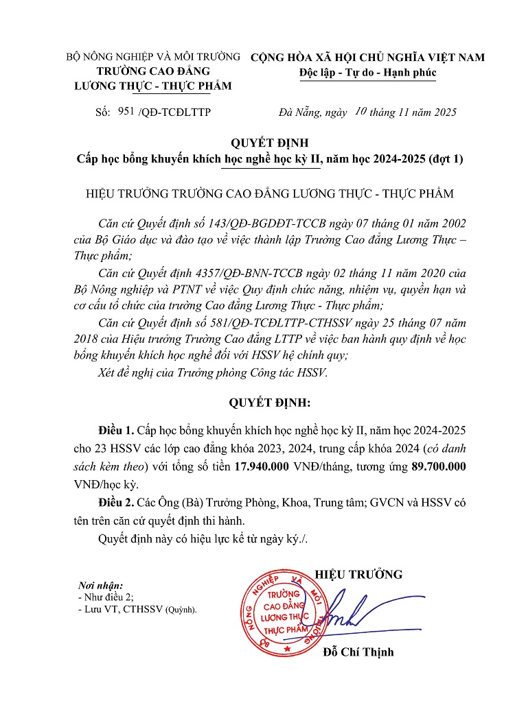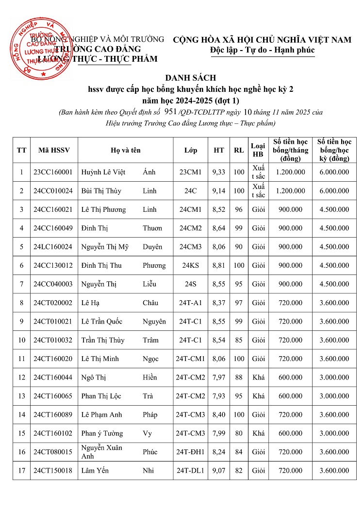 Quyết định cấp học bổng khuyến khích học tập học kỳ 2 năm học 2024-2025 (đợt 1)