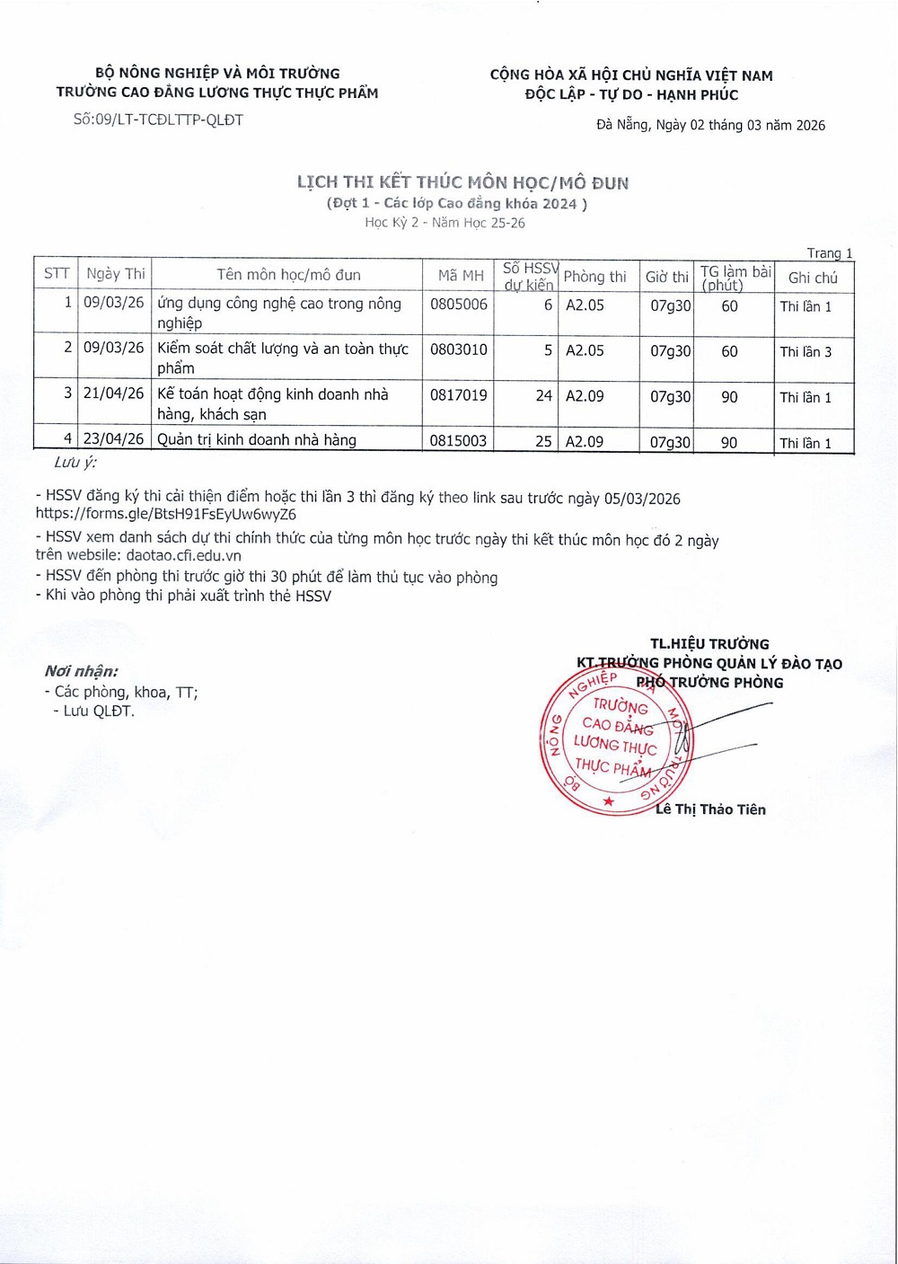 Lịch thi kết thúc môn học/mô đun đợt 1 (các lớp Cao đẳng khóa 2024) - Học kỳ 2 năm học 2025-2026