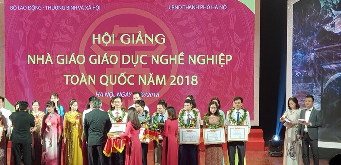 Cô giáo Hương Giang (thứ 2 từ phải qua) nhận Bằng khen Hội giảng Nhà giáo Giáo dục nghề nghiệp toàn quốc năm 2018