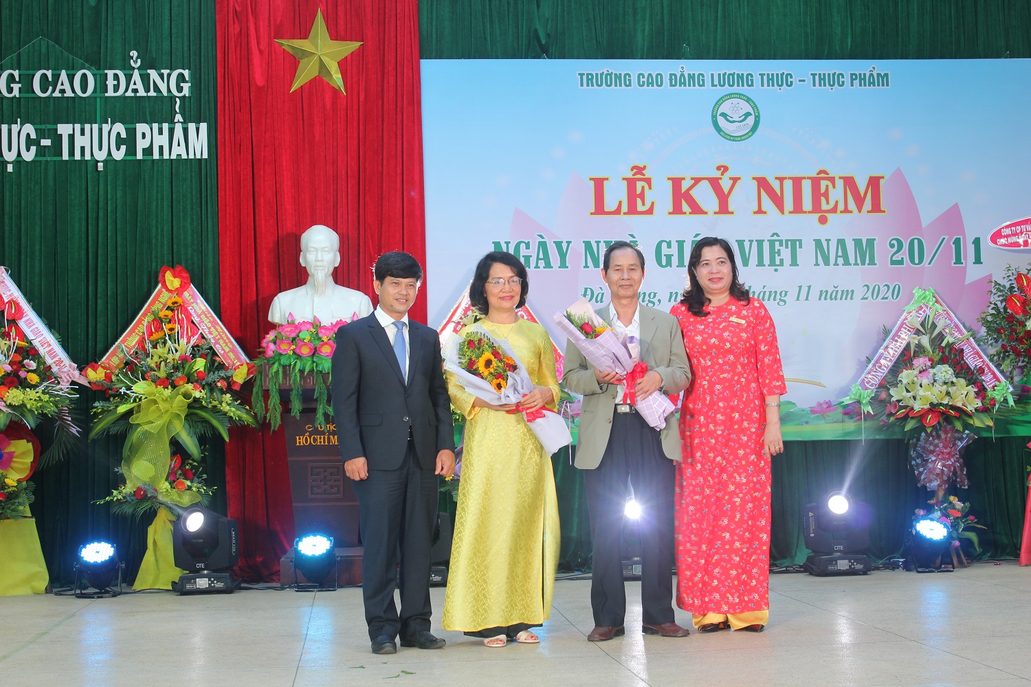 ThS. Đào Thị Minh Tâm - Bí thư Đảng ủy, TS. Đỗ Chí Thịnh - Hiệu trưởng nhà trường tặng hoa tri ân đến Nguyên Hiệu trưởng nhà trường thầy Trần Quốc Việt, nguyên Quyền Hiệu trưởng nhà trường cô giáo Huỳnh Thị Kim Cúc