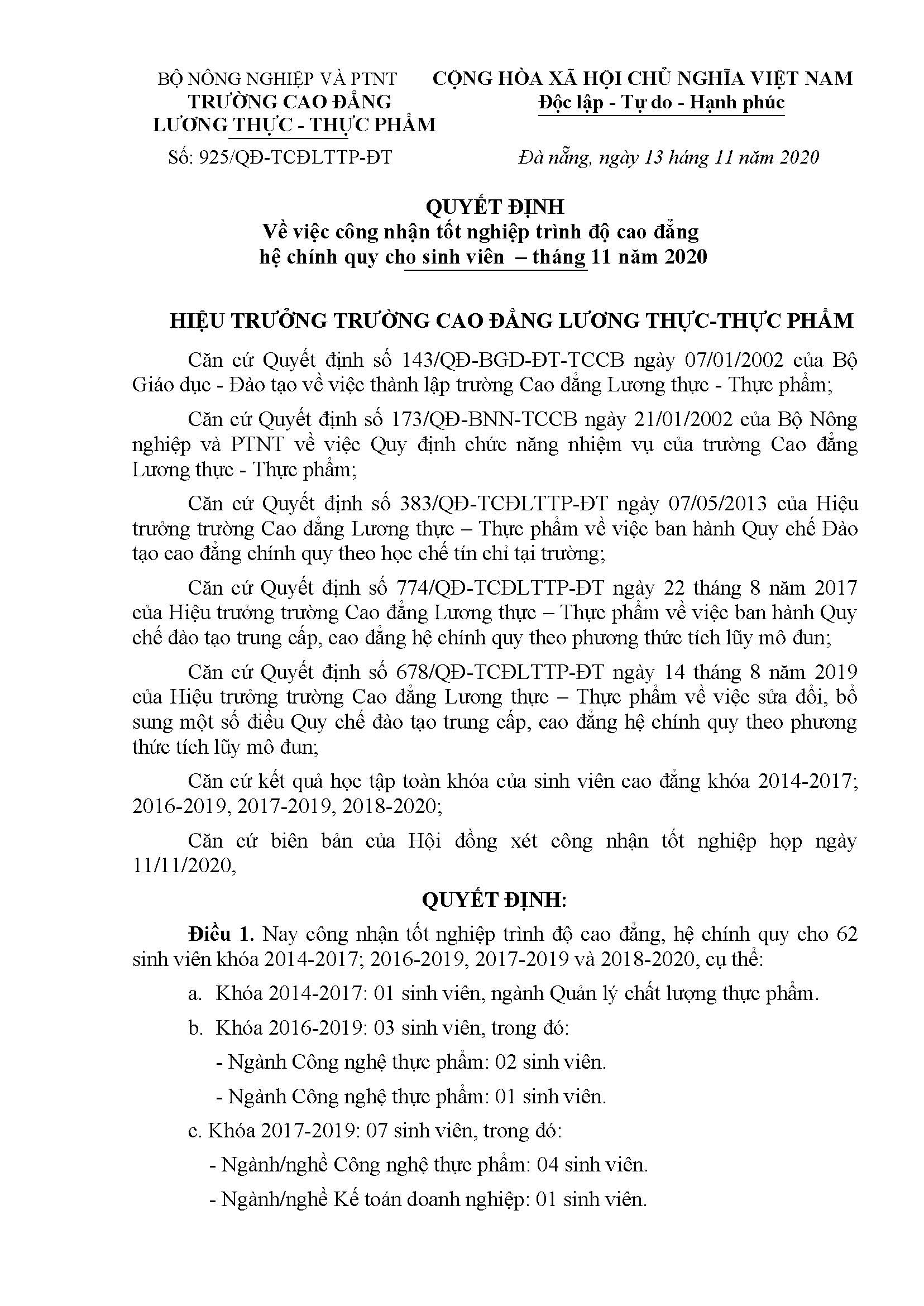 Quyết định công nhận tốt nghiệp trình độ Cao đẳng - tháng 11 năm 2020Tải Danh sách kèm theo quyết định số 925/QĐ-TCĐLTTP-ĐT về việc công nhận tốt nghiệp trình độ cao đẳng - tháng 11 năm 2020 tại đây: Download tài liệu