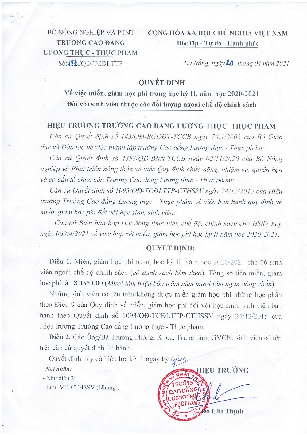 Quyết định miễn, giảm học phí trong HKII năm học 2020-2021 đối với HSSV thuộc các đối tượng ngoài chế độ chính sách