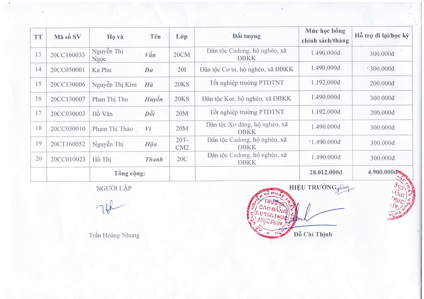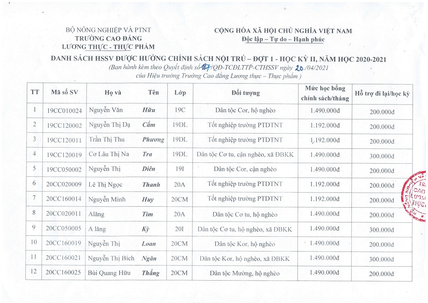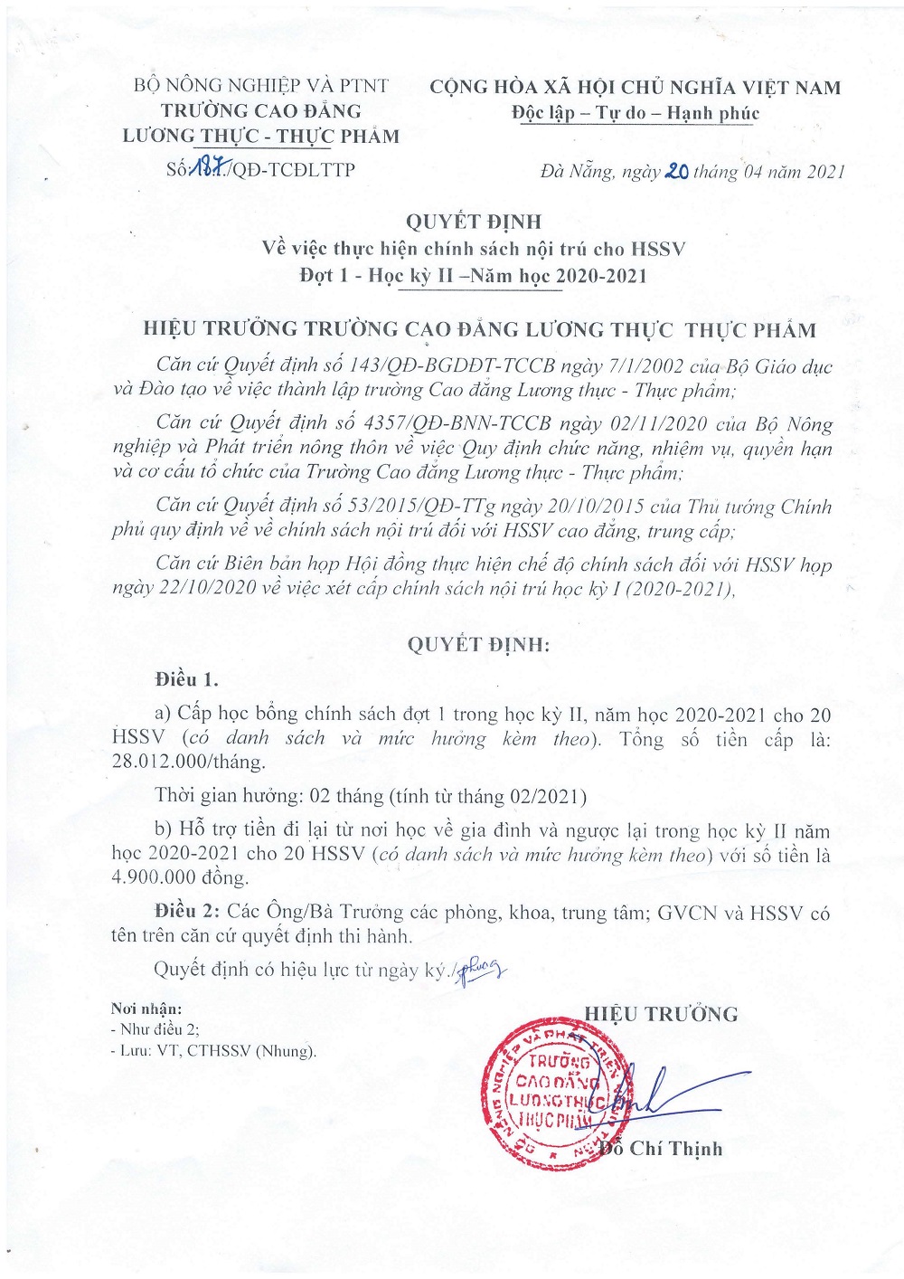 Quyết định thực hiện chính sách nội trú cho HSSV đợt 1- HKII, năm học 2020-2021