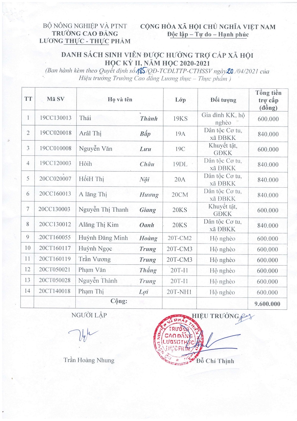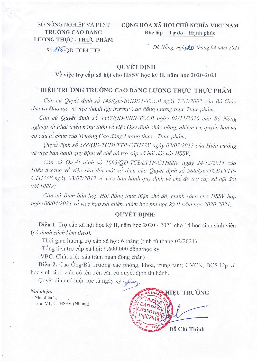 Quyết định trợ cấp xã hội cho HSSV học kỳ II, năm học 2020-2021