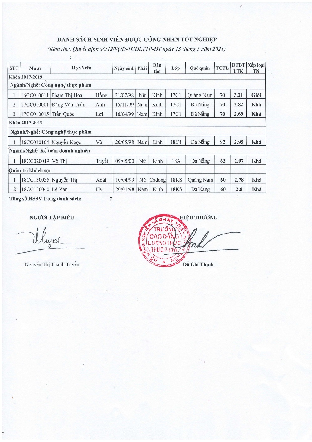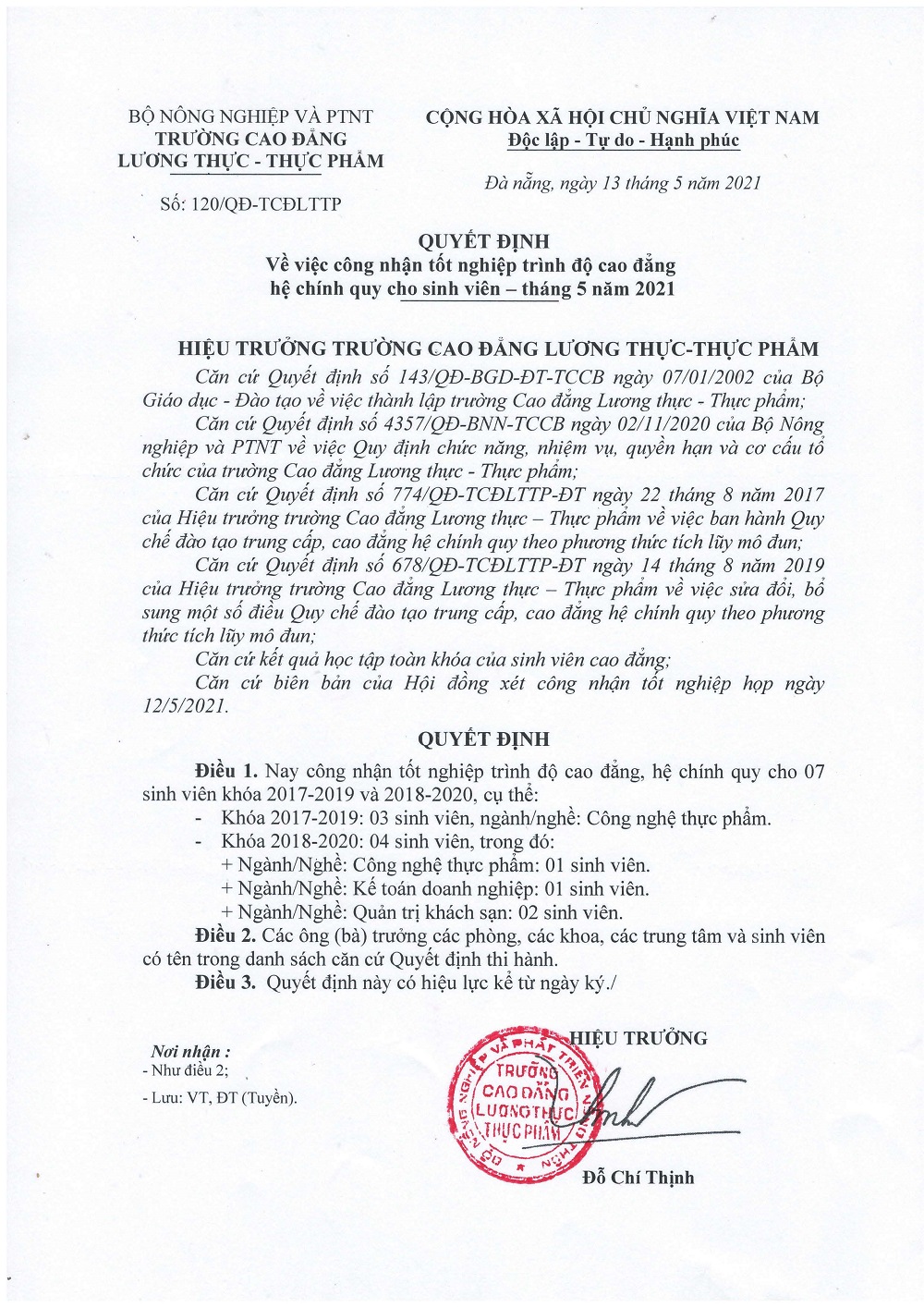 Quyết định công nhận tốt nghiệp trình độ Cao đẳng tháng 5-2021