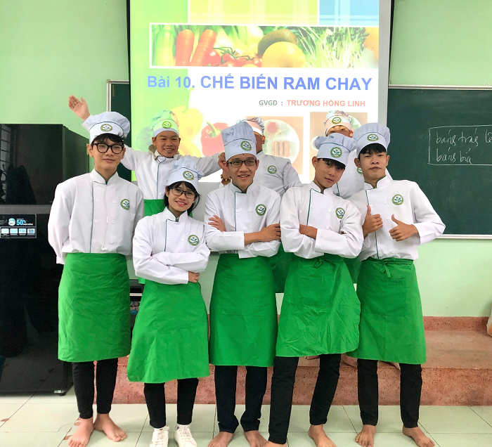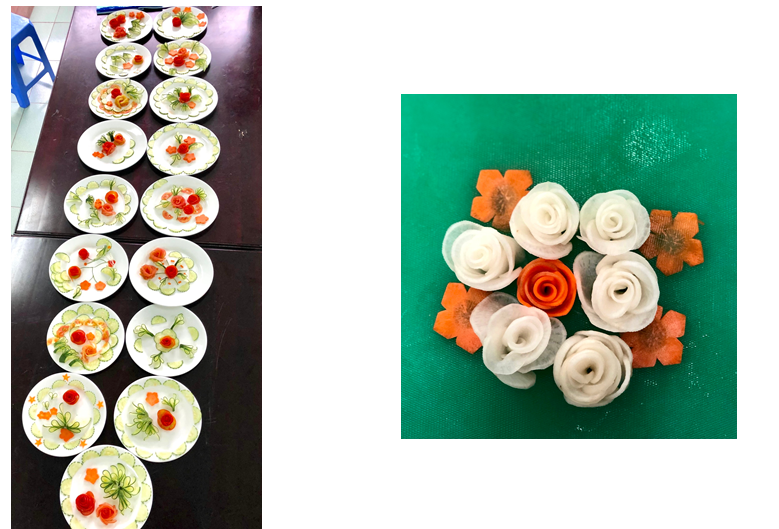 Nhiều HSSV dù chưa một lần vào bếp, chưa biết cầm dao, cắt thái,….nhiều HSSV còn nhầm lẫn giữa các nguyên liệu và gia vị chế biến món ăn… Thế nhưng, qua quá trình thực hành, các bạn đã thu nhận được những kỹ năng cơ bản cho nghề, từ kỹ năng sử dụng dao, thớt, định hình nguyên liệu đến các kỹ năng xóc chảo, fillet, cuốn ram,…..