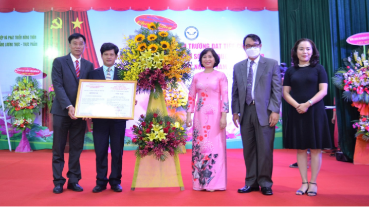 Hình 1: Ban giám hiệu trường Cao đẳng Lương thực – Thực phẩm Đà Nẵng nhận Giấy chứng nhận đạt tiêu chuẩn kiểm định chất lượng cơ sở giáo dục nghề nghiệp của công ty TNHH Sài Gòn Academy do Bộ trưởng Bộ Lao động – Thương binh và Xã hội ban hành.
