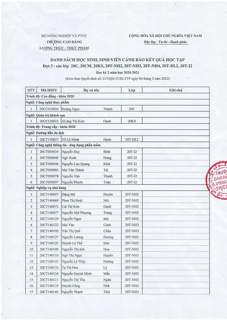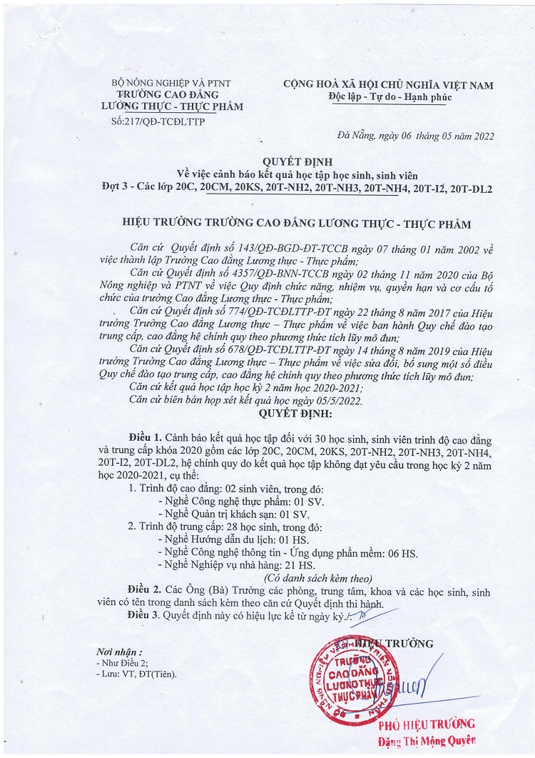 Quyết định cảnh báo kết quả học tập HSSV đợt 3 - năm 2022