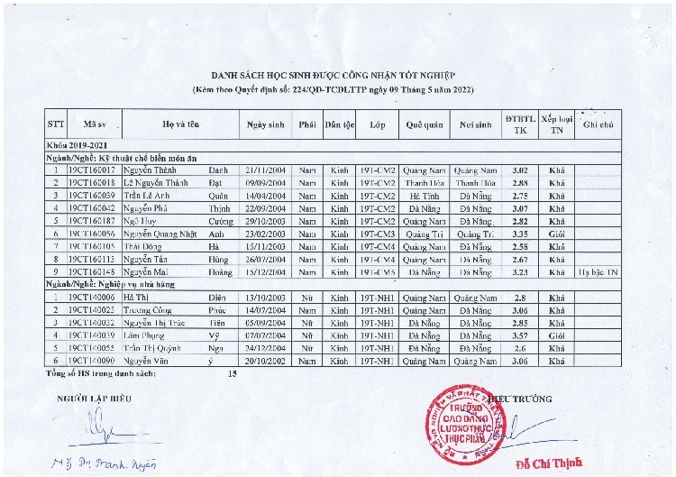 Quyết định công nhận tốt nghiệp trình độ Trung cấp cho học sinh khóa 2019-2021