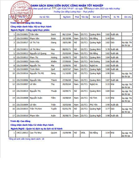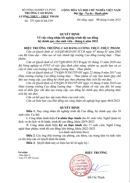 Quyết định công nhận tốt nghiệp trình độ Cao đẳng - tháng 6.2023