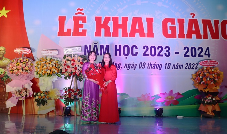 Cô giáo Đặng Thị Mộng Quyên nhận hoa chúc mừng từ đại diện HSSV toàn trường nhân dịp Lễ khai giảng năm học