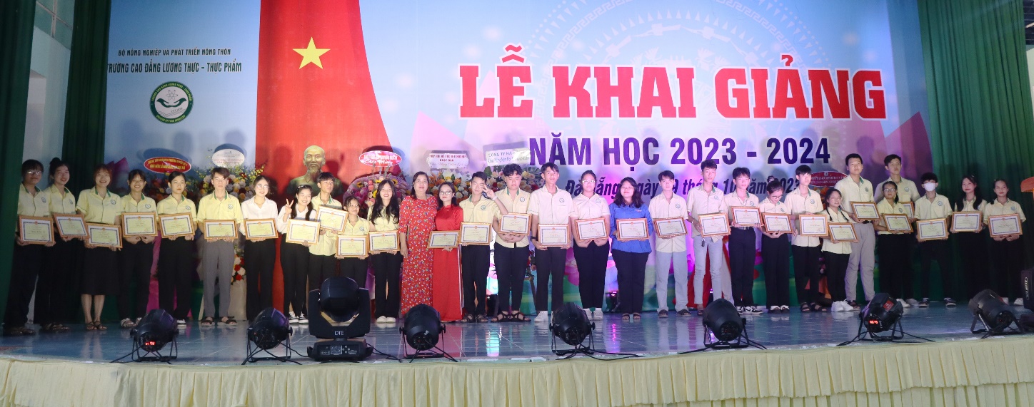 Nhân dịp lễ khai giảng, nhà trường đã tổ chức tuyên dương khen thưởng 5 HSSV đạt kết quả cao trong kỳ tuyển sinh năm 2023. Các em có kết quả học tập giỏi ở bậc phổ thông, cơ hội đại học luôn rộng mở, nhưng các em đã chọn con đường học tập tại ngôi trường Cao đẳng Lương thực – Thực phẩm để theo đuổi ước mơ nghề nghiệp của mình.