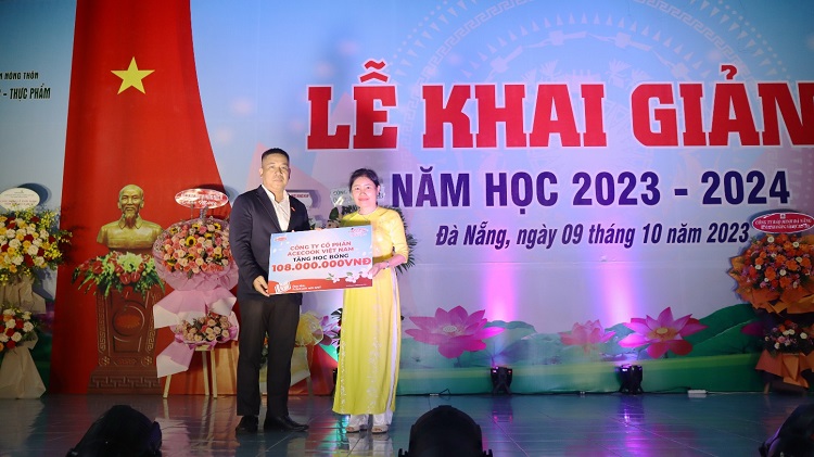 Cô giáo Phạm Thị Phương – Trưởng phòng Công tác HSSV tiếp nhận quỹ học bổng từ đại diện công ty – Ông Nguyễn Ngọc Sơn, giám đốc chi nhánh Công ty Acecook tại Đà Nẵng