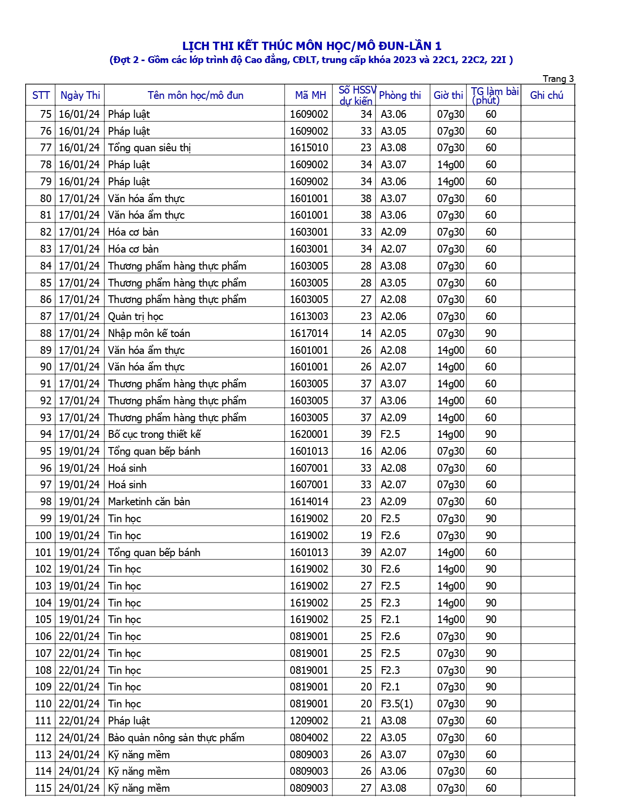 Lịch thi kết thúc môn học/mô đun - lần 1(Đợt 2 - Gồm các lớp trình độ Cao đẳng, CĐLT, trung cấp khóa 2023 và 22C1, 22C2, 22I ) - HK1 năm học 2023-2024 Lịch thi kết thúc môn học/mô đun - lần 1(Đợt 2 - Gồm các lớp trình độ Cao đẳng, CĐLT, trung cấp khóa 2023 và 22C1, 22C2, 22I ) - HK1 năm học 2023-2024