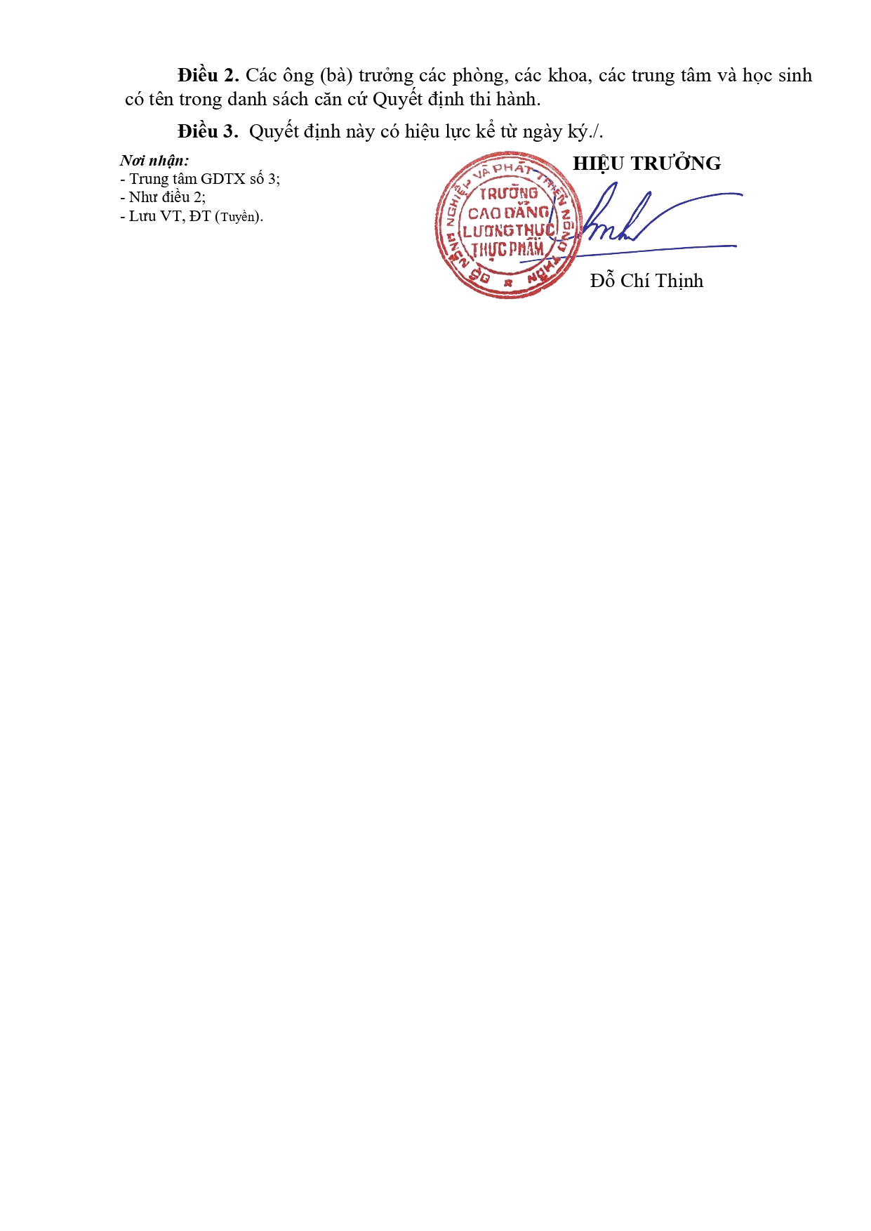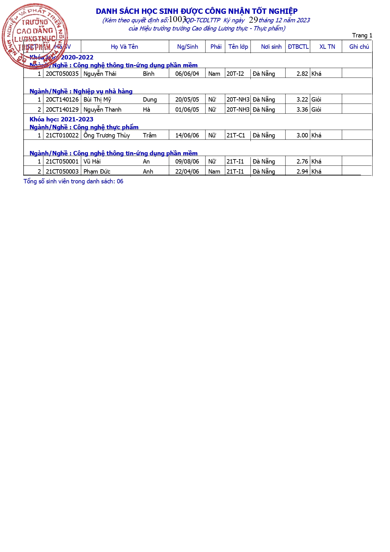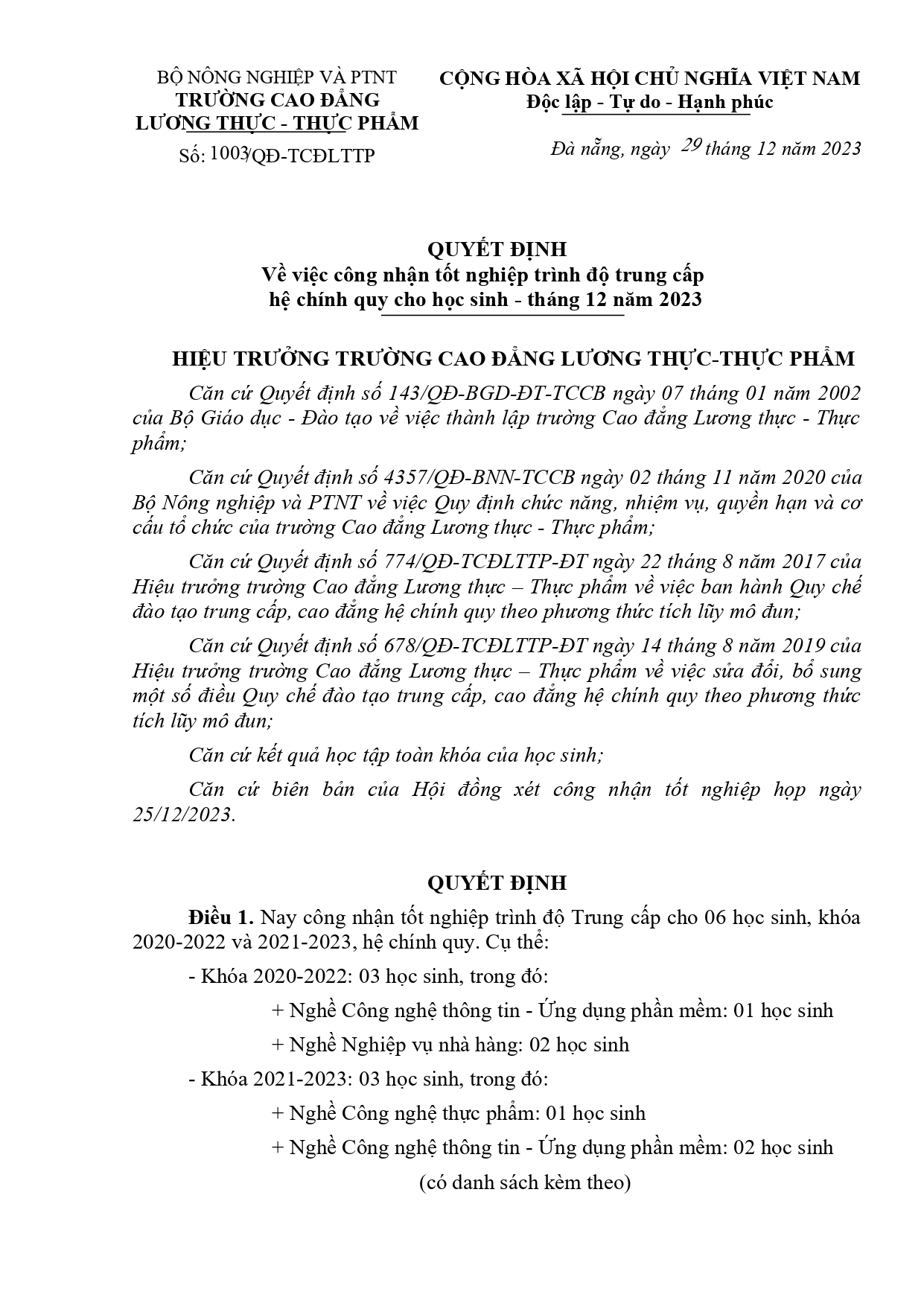 Quyết định công nhận tốt nghiệp trình độ trung cấp hệ chính quy cho học sinh - tháng 12 năm 2023