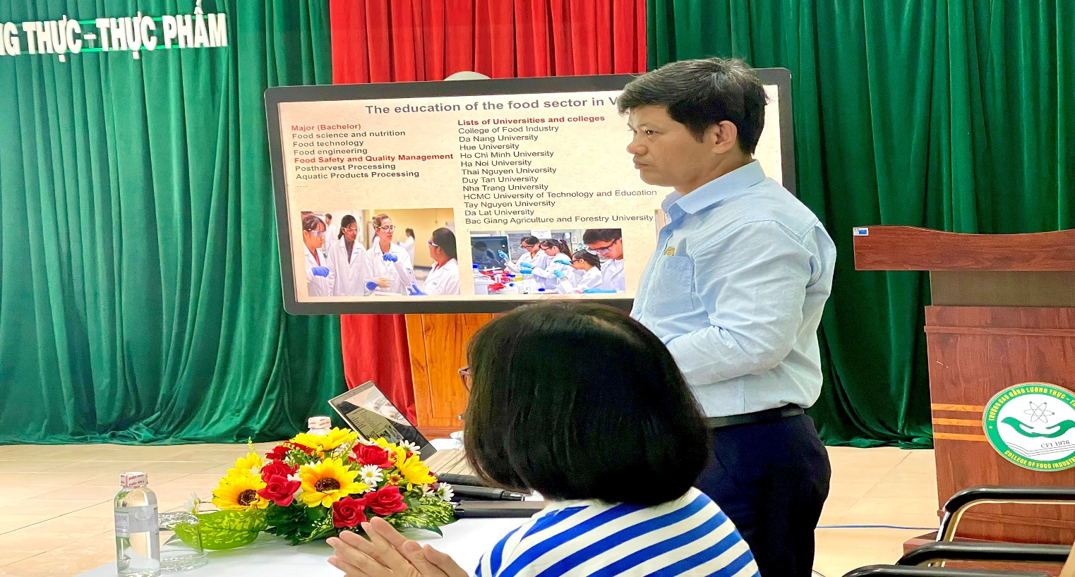 Đại diện nhà trường, TS. Đỗ Chí Thịnh – Hiệu trưởng nhà trường bày tỏ sự vui mừng chào đón đoàn đã ghé thăm trường. Đồng thời trong buổi làm việc, TS. Đỗ Chí Thịnh đã có bài thuyết trình trước các em sinh viên của trường Đại học Chiang Mai – Thái Lan về giáo dục ngành thực phẩm và tương lai của ngành thực phẩm ở Việt Nam.