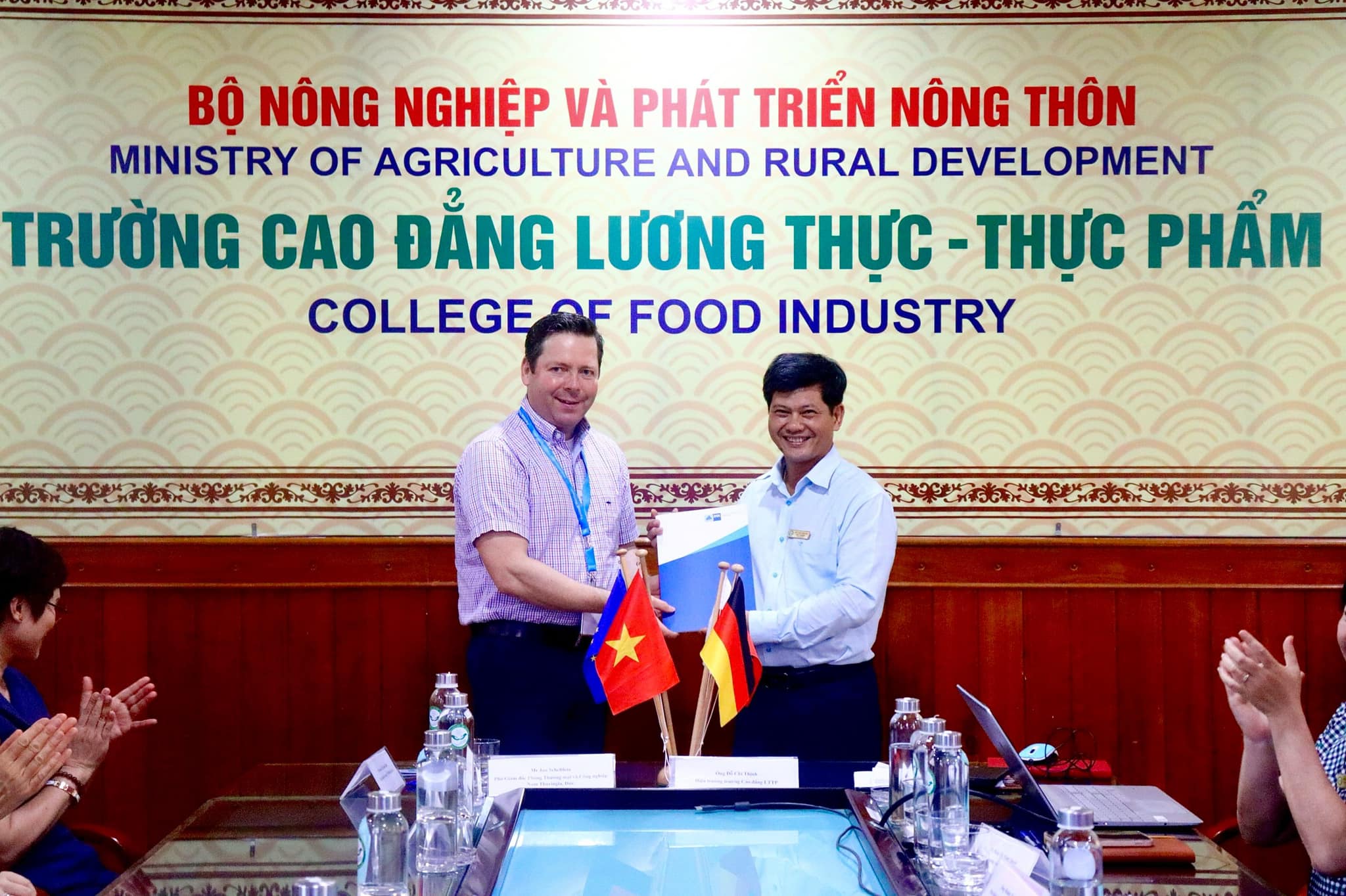Ông Jan Scheftlein, Phó Giám đốc Phòng Thương mại và Công nghiệp Nam Thuringia, Đức, đã trao chứng nhận công nhận toàn phần cho bằng Cao đẳng ngành Công nghệ Thực phẩm cho Ts. Đỗ Chí Thịnh - Hiệu trưởng nhà trường
