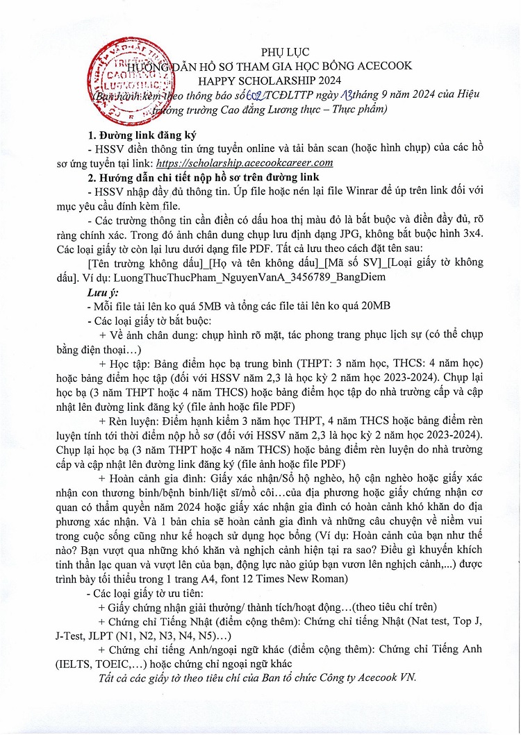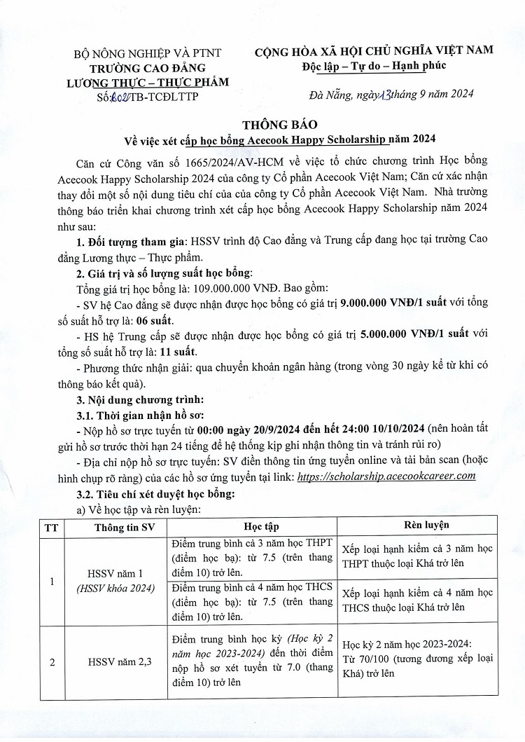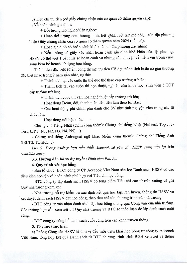 Thông báo về việc xét cấp học bổng Acecook Happy Scholarship 2024